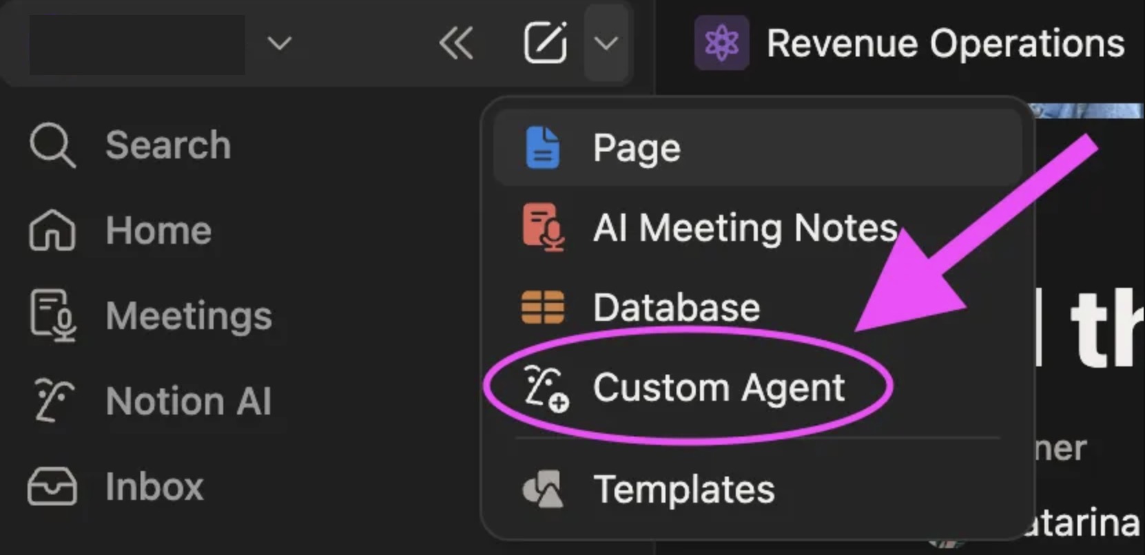 Navigate to the top left corner, click the little menu arrow next to the Create a new page button, and select Custom Agent.